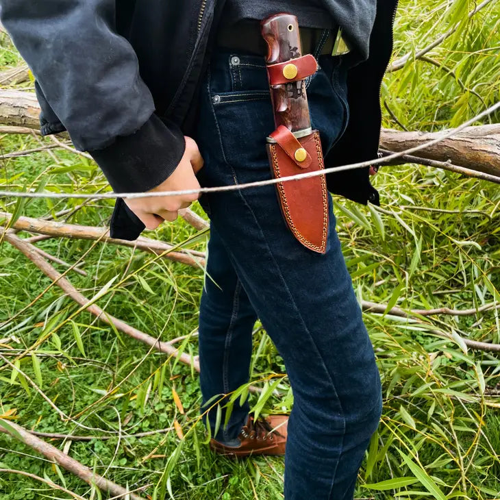 Damascus Hunting/utility knife is handcrafted to be functional and not just for looks. Utility Knife has over 18 hrs of work into it including forging, filing, fitting, grinding, polishing. The Black Walnut scales are locked in place with the multiple Brass pins. The handle gives a very smooth yet sturdy grip which feels natural when held in the hand. The knife is weighted to have a balance point just right where the blade meets the handle, to better help in hunting Jobs. Remarkable workmanship on this knife! Damascus steel hand forged with combinations of 1095 High Carbon and 4340 High Tensile Steel forming over 450+ layers.
