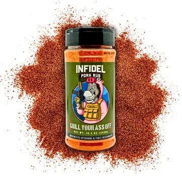 Take your pork dishes to the next level with Infidel Pork Rub™, a bold and aromatic bbq rub designed to enhance the natural flavors of pork. This expertly crafted blend of sweet brown sugar, smoky chipotle, and zesty spices creates the perfect balance of heat and richness, making it a must-have for ribs, roasts, tenderloins, and more. ✅ Perfect for: Ribs, pork shoulder, roasts, tenderloins, and all your favorite BBQ dishes. • A flavorful mix of brown sugar, chipotle, and savory spices and seasonings delivers the perfect blend of sweetness, smokiness, and heat. • It works as both a brisket rub and a BBQ seasoning, ideal for grilling, smoking, and roasting any cut of meat. • Made without MSG, gluten, or GMOs, ensuring a clean, high-quality blend of bbq seasonings and rubs with bold, natural flavor. • The 10.5oz shaker bottle makes it easy to season precisely at home or in professional kitchens. • Proudly veteran-owned, with every purchase supporting nonprofit veteran organization